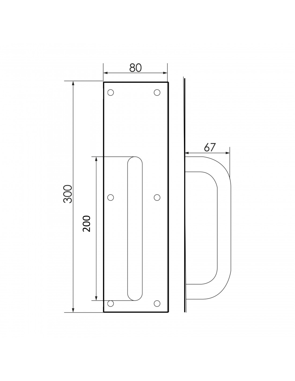MEDIDAS: Placa: 300mm x 80mm largo total Manillón: 67mmx200mmx19Ø