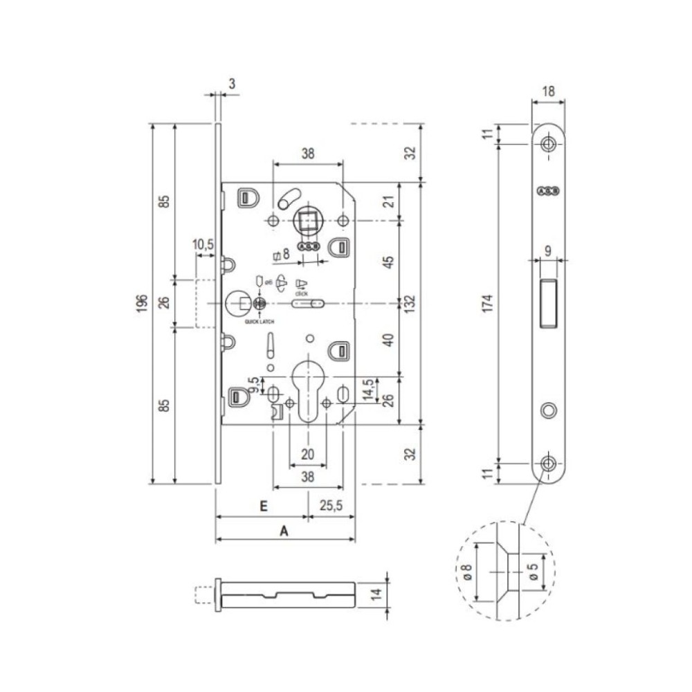 MEDIDAS: Entrada 50mm. / Prtofundidad 76mm. / Largo Total 196mm. / Frente 18mm.